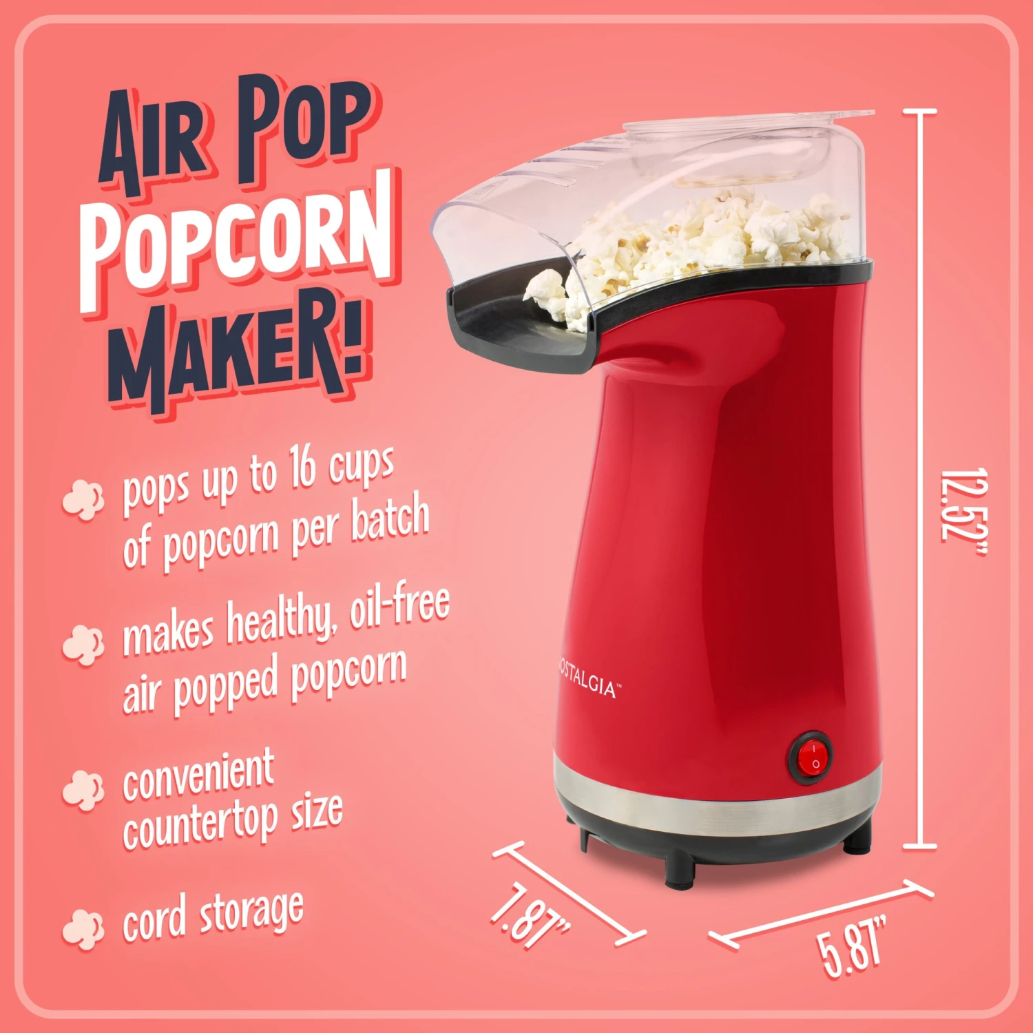 - HEALTHIER POPCORN: Machine uses hot air instead of oil to quickly pop 16 cups of hot and fresh popcorn for a delicious low-fat & guilt free treat