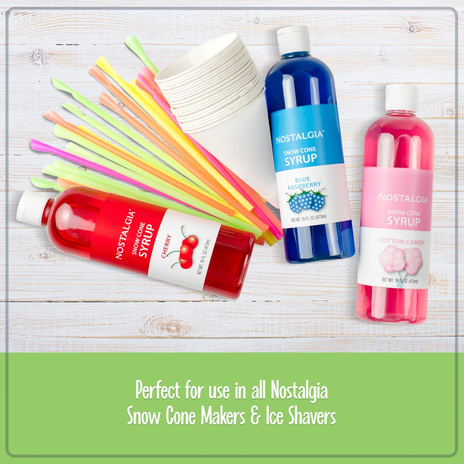 - COMPATIBLE WITH NOSTALGIA KITS: Works perfectly with all Nostalgia snow cone kits, including the Snow Cone Kit, Snow Cone Syrups, or the Straws and Cups.