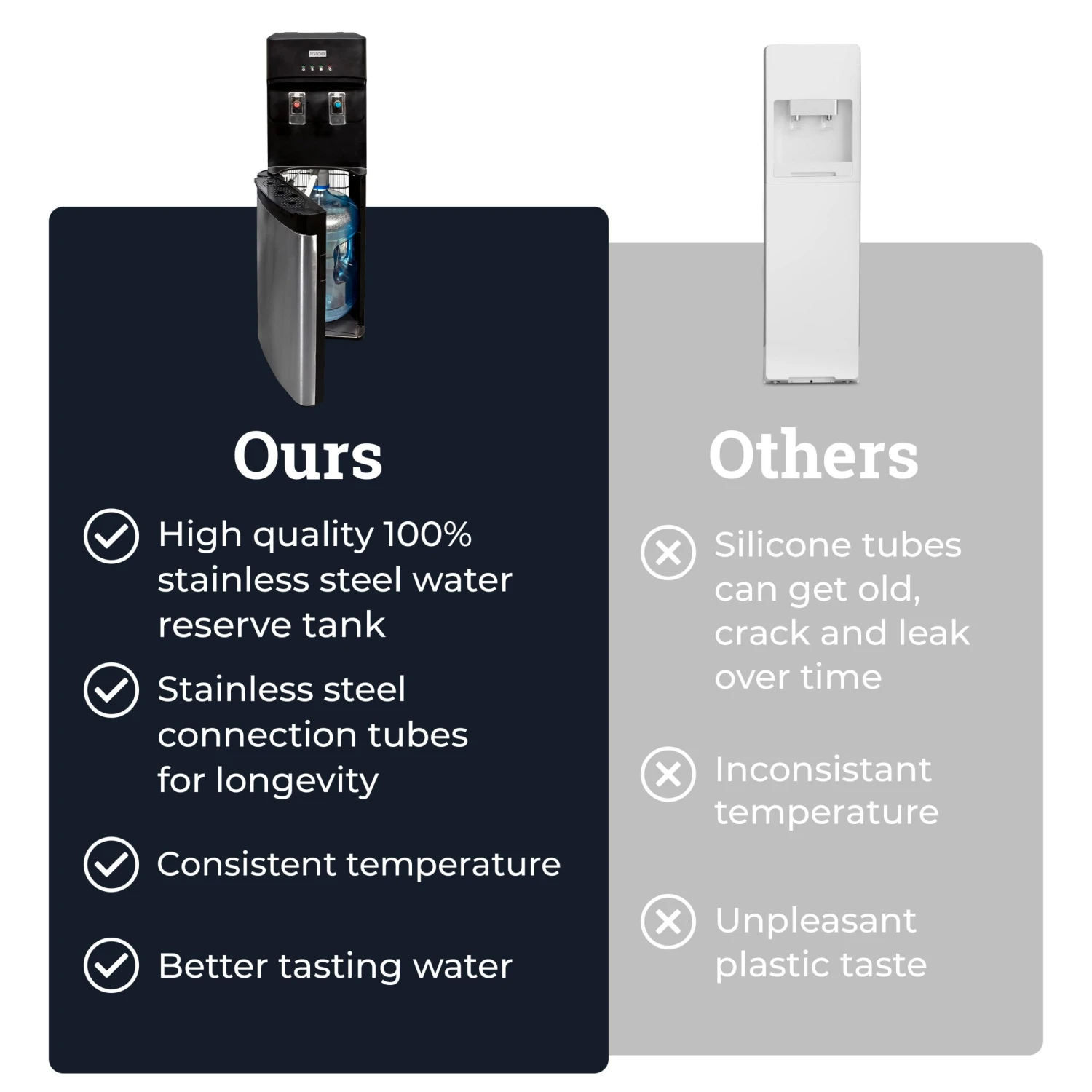 - BOTTOM-LOADING DISPENSER: Features an easy-to-use, convenient bottom-loading water system. No lifting, flipping, or spilling while keeping the bottle tucked away in a cabinet below. Suitable for 3 and 5 gallon water bottles (not included).