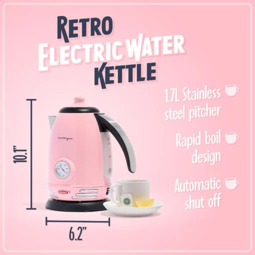 Retro 1.7-Liter Stainless Steel Electric Water Kettle With Strix Thermostat, Pink