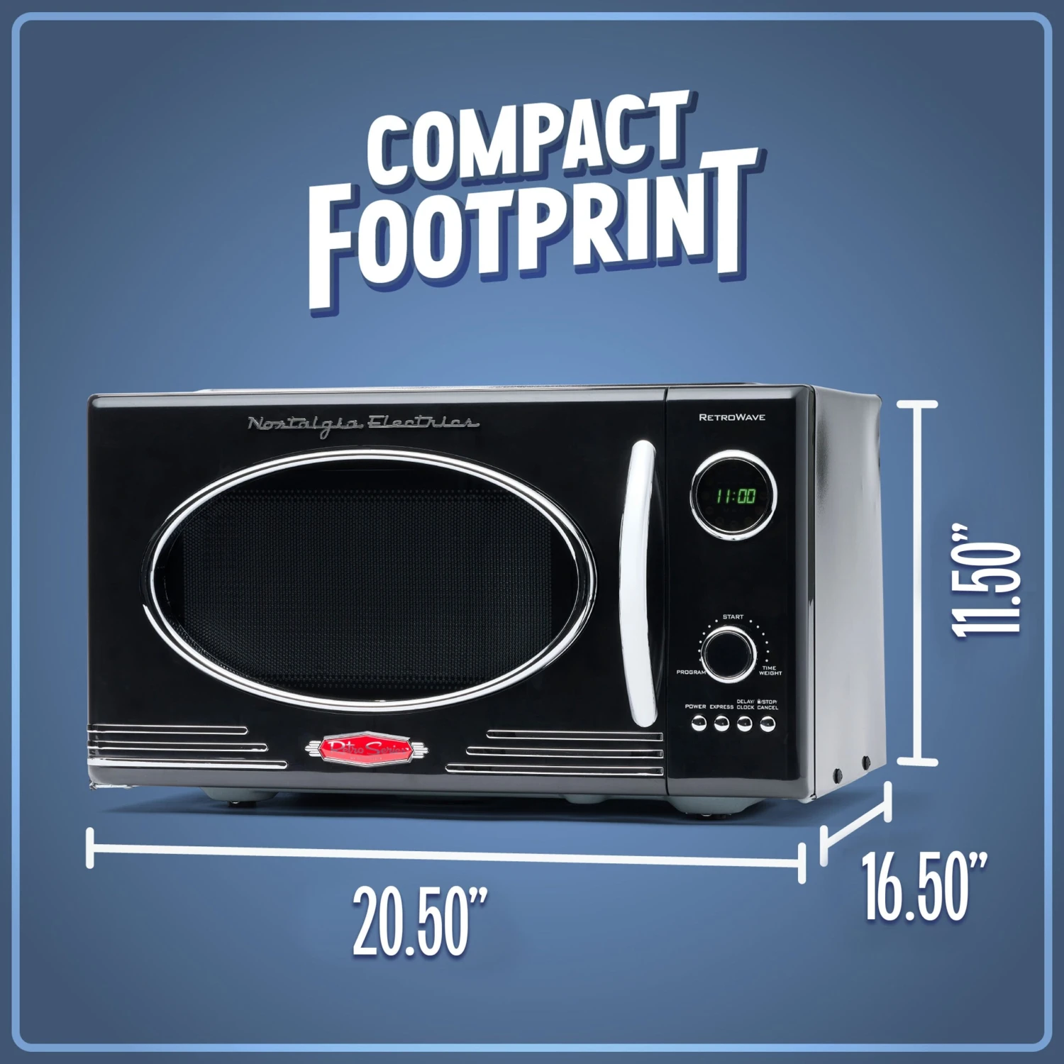 - RETRO ACCENTS: A sleek chrome door handle, control panel and accents add fun and flair to this unique retro-styled appliance