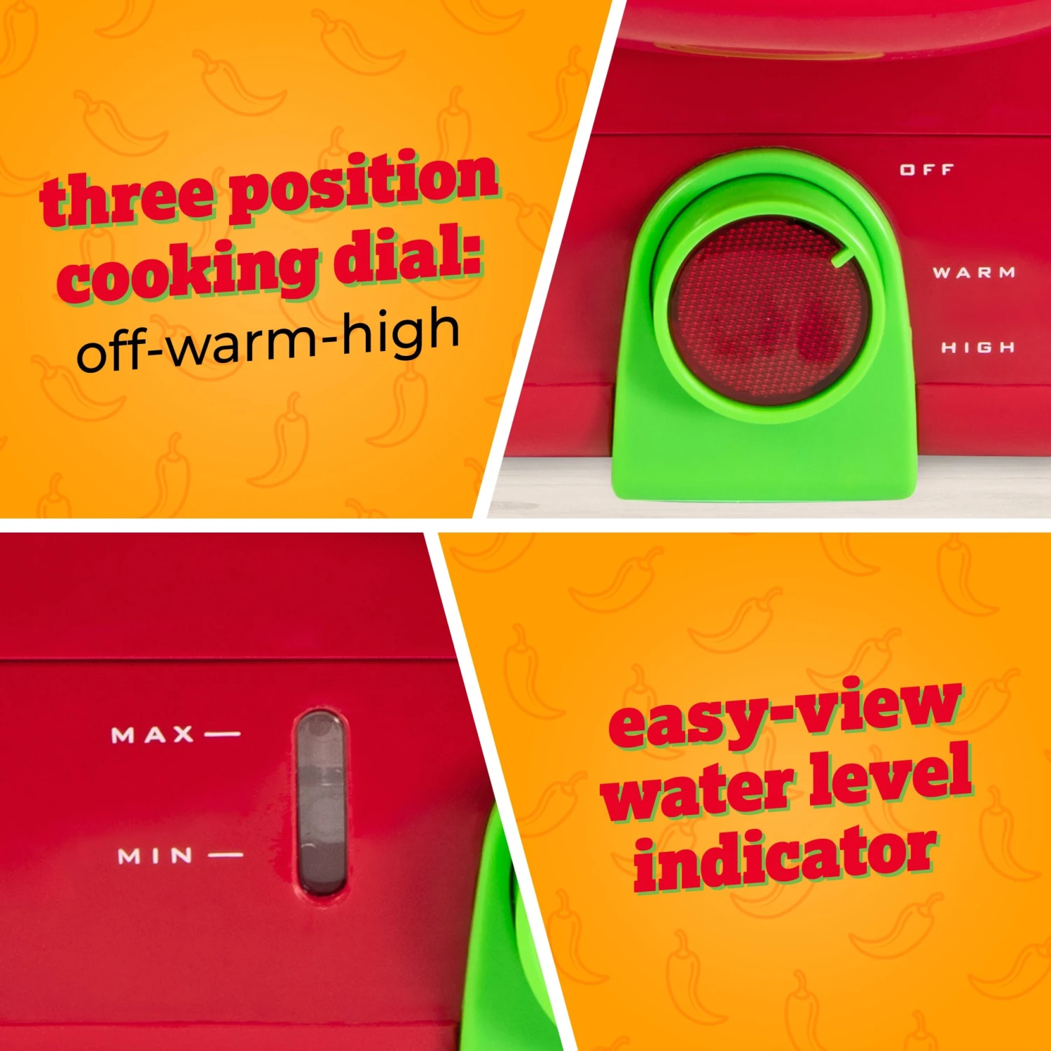 - EASY-TO-USE: 3-position cooking dial (High, Warm and Off) makes cooking effortless – simply add water, put the cover on and turn to High and steamed tamales ready will be ready in 15-20 minutes.