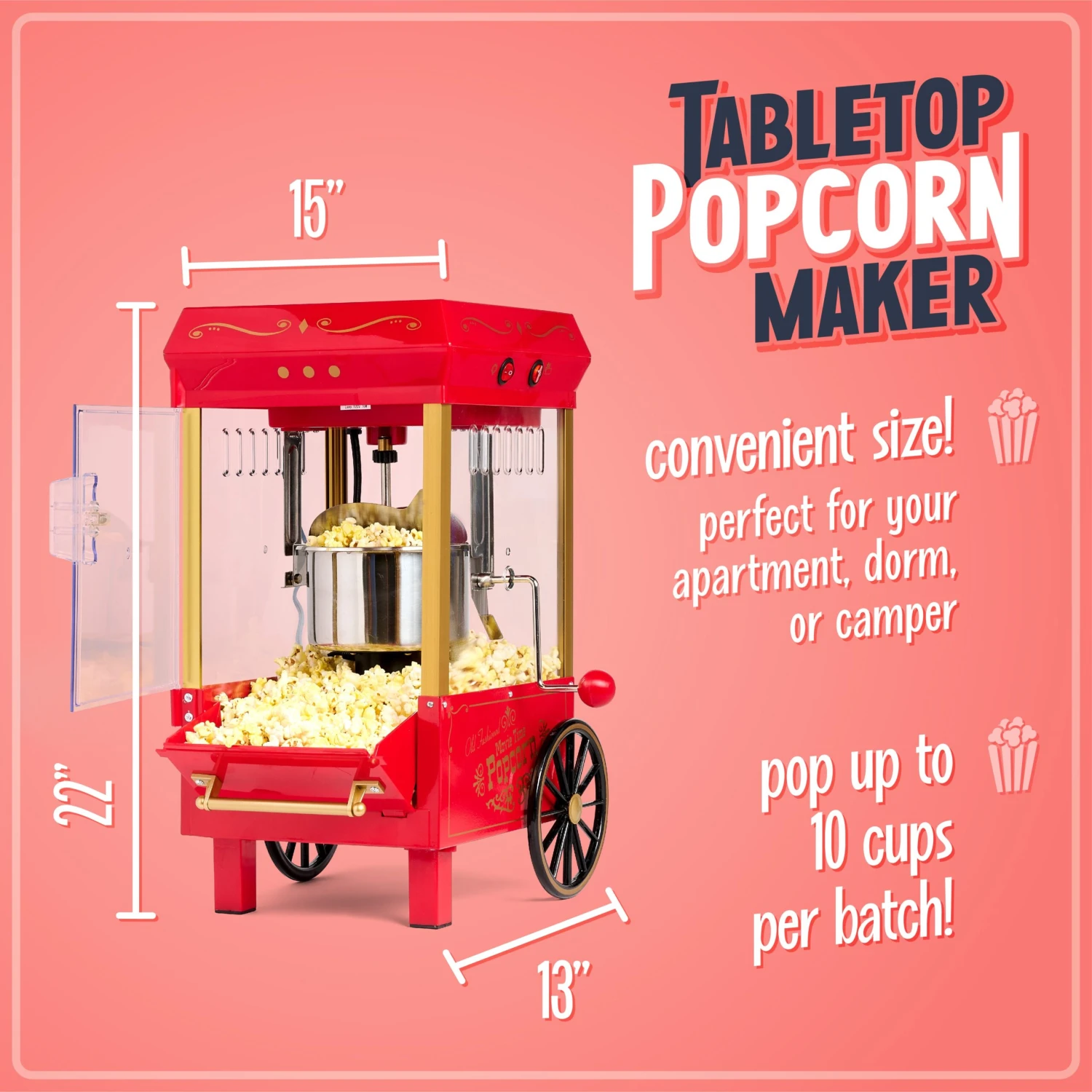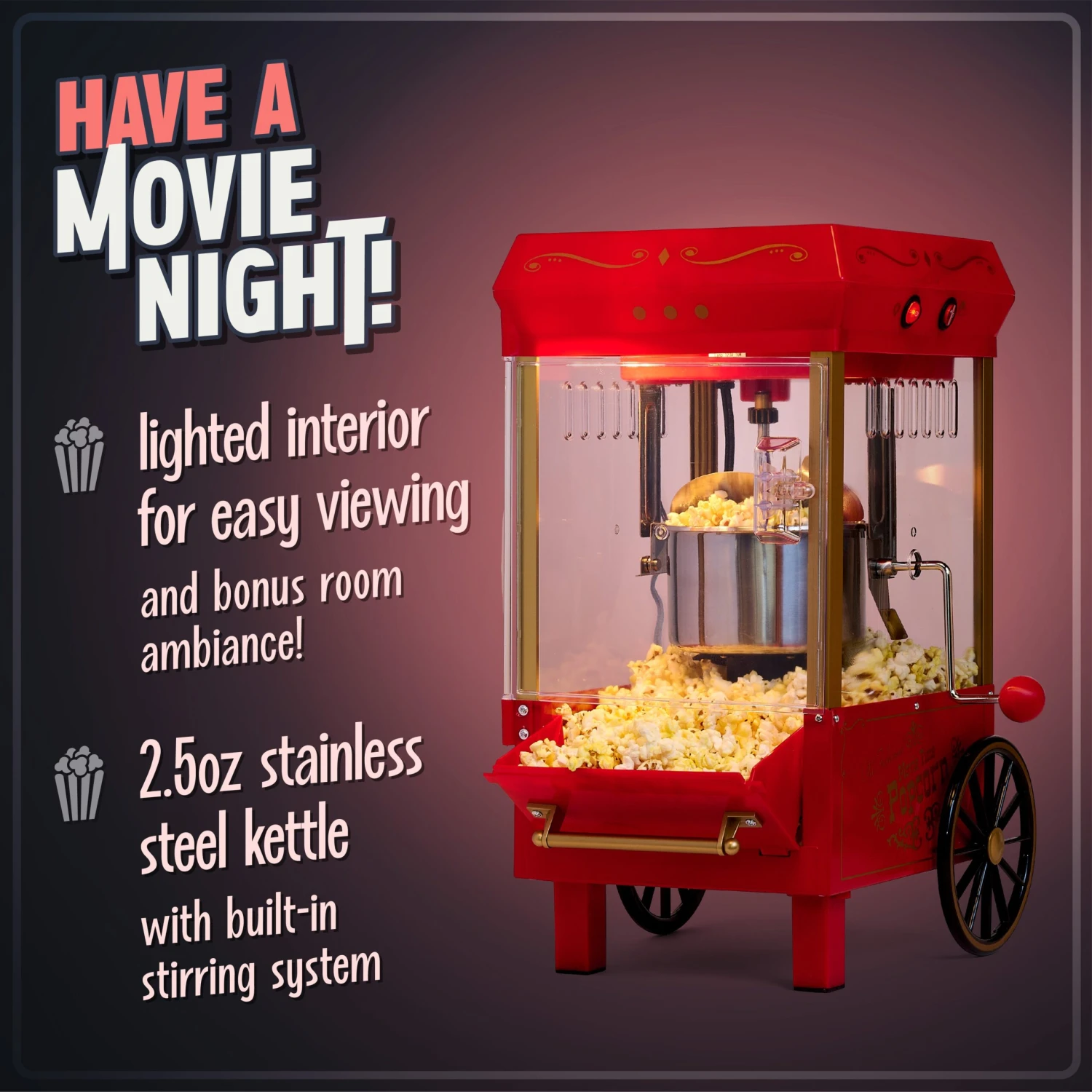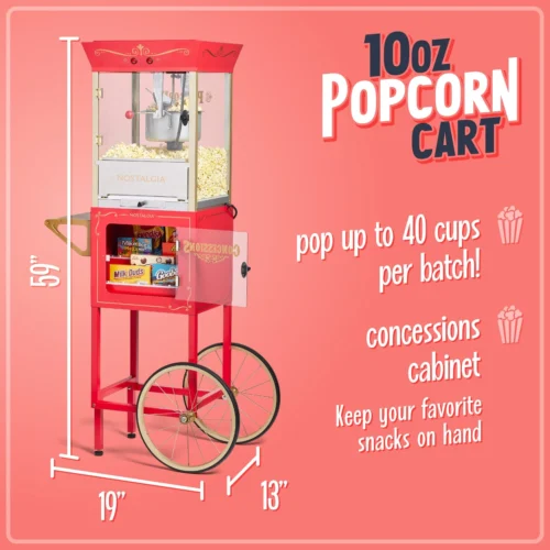 - MOVIE THEATER POPCORN AT HOME: Whether it’s movie night or snack time, this cart pops up to 10 cups of movie theater-style popcorn per batch to keep popcorn buckets full